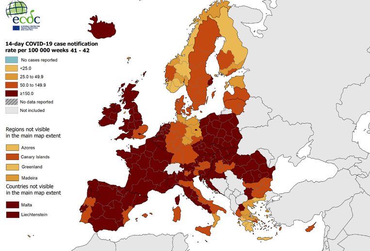 Intussen is 80 procent van de europese landen over de drempel van 120 nieuwe besmettingen per 100.000 inwoners gegaan. Deze cijfers laten zien dat vrijwel alle europese landen een stijgende lijn laten zien in het aantal infecties. Volgens het ecdc, dat de gegevens van de 27 landen van de eu, noorwegen, ijsland, liechtenstein en het verenigd koninkrijk verzamelt, telt tsjechië op dit moment 1.379,8 besmettingen. Hieronder vindt u het aantal besmettingen per 100 duizend inwoners in de afgelopen week in europa, waar mogelijk per regio. Zoek op onderstaande tabel specifiek naar uw eigen. Gemiddeld aantal positief geteste mensen per 100.000 inwoners 3,8 signaalwaarde: Ook de situatie in ziekenhuizen verbetert geleidelijk. Met 1.391 nieuwe besmettingen per 100.000 inwoners in twee weken staken we tsjechië voorbij, dat toen 1.380. Het rivm meldde woensdag 7.305 positieve tests, omgerekend 42 per 100.000 inwoners. Dat blijkt uit cijfers van de europese unie. Op dit moment is een gebied oranje als de incidentie boven de 150 per 100.000 inwoners per 14 dagen ligt. In de meeste andere europese landen is het aantal besmettingen nog veel lager. Het gemiddelde aantal besmettingen lag afgelopen week in spanje op 58/100.000, de tweewekelijkse incidentie stabiliseert: